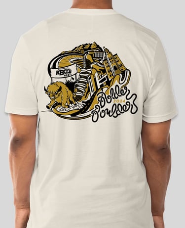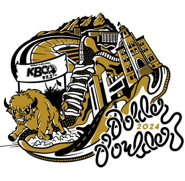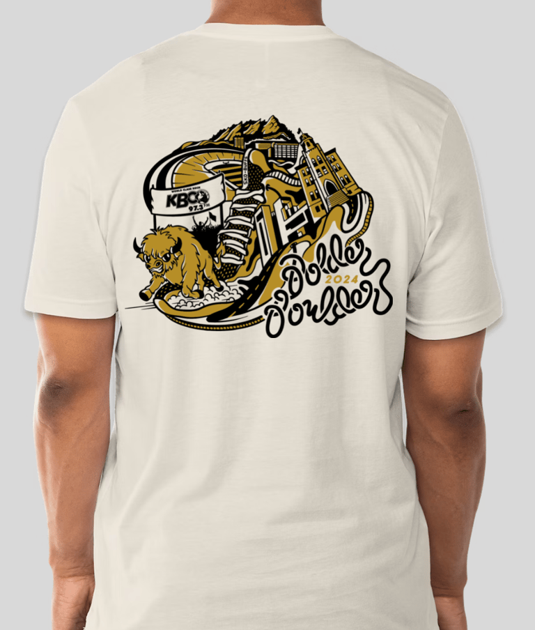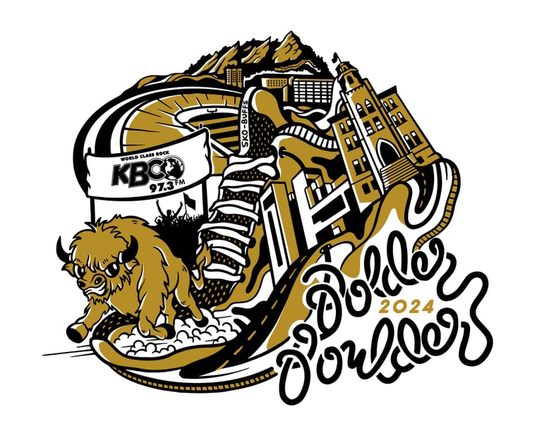 This commemorative T-shirt design for the Bolder Boulder race captures the spirit of Boulder, CO—featuring hand-drawn illustrations of Folsom Field, the Flatirons, iconic city landmarks, and a bold cameo from Ralphie the buffalo. A wearable celebration of local pride and race day energy.